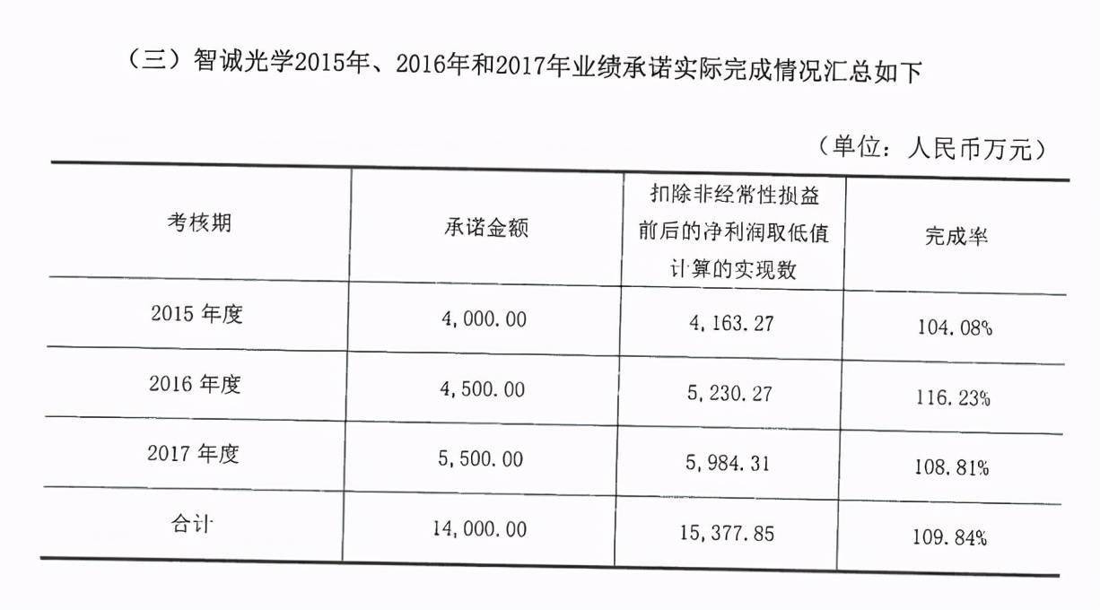 彼時,約定在2015年至2017年度業績對賭期內,各年度分別實現淨利潤4000萬元、4500萬元、5500萬元。最終,智誠光學完美地「完成了業績承諾」,三年合計實現淨利潤約1.54億元,完成率109.84%。