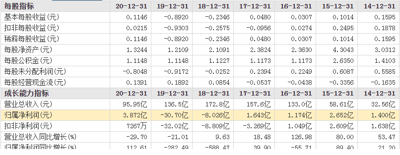 在連續2年虧損,2020年終於實現盈利。財報顯示,2020年公司實現營收95.95億元,同比下降29.70%,歸母淨利潤為3.87億元,但扣非淨利潤只有7267萬元。雖然實現扭虧,但主業盈利能力仍未能回暖。