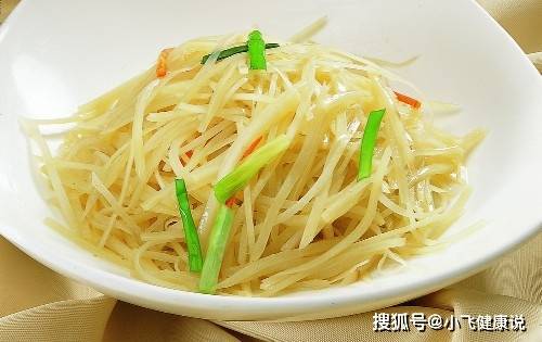 做法:土豆削去皮,先切成薄片,再改刀切成細絲,愈細愈好。用冷水泡上,約20分鍾後,將水控淨。蔥去根及干皮,切成細絲。
