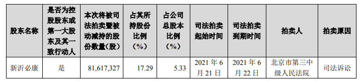 5月24日晚間,延安必康又曝出控股股東持股將被司法拍賣。根據公告顯示,控股股東新沂必康持有的約8161.73萬股,占總股本比例5.33%,將於6月21日10時至6月22日10時在「阿里拍賣·司法」網絡平台拍賣。