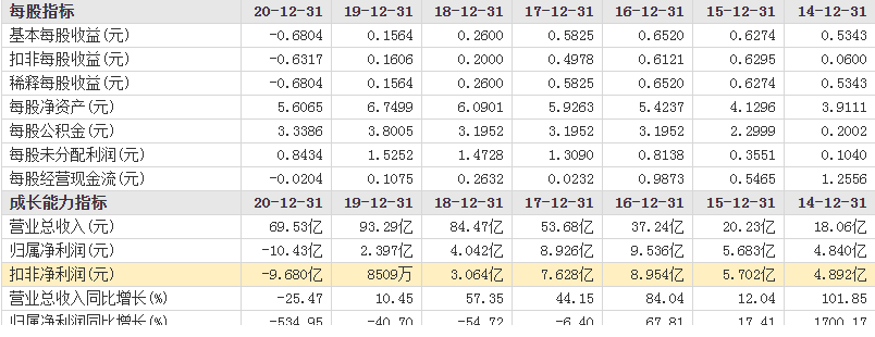 2020年更慘,延安必康營收降至69.53億元,歸母淨利潤巨虧10.43億元,扣非淨利潤為-9.68億元;這里還有一個小插曲:一開始公司預計2020年淨利潤虧損3.5億元至4.9億元,結果在4月27日晚間公告中,公司將淨利潤下修至虧損11億元-12億元。
