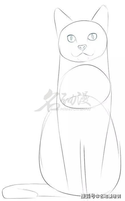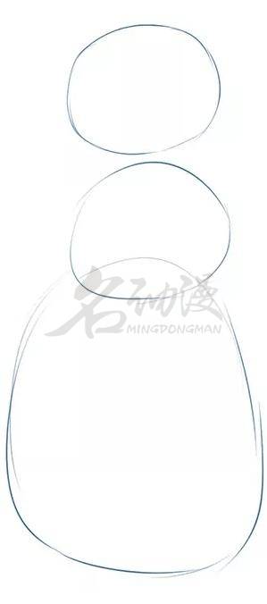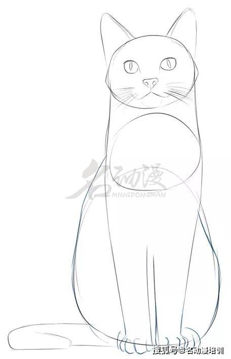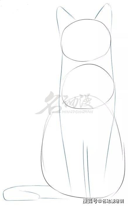 第一步:首先要畫出貓大概的輪廓,確定好貓的形狀大小,以及動作的動態。畫出兩個相同的圓表示貓的頭部和胸部和一個有點不規則的大橢圓形表示貓的下體部分。在這一步所畫的線條都要是使用力度非常輕的線條,可以用鉛筆來刻畫這一步。如圖所示:
