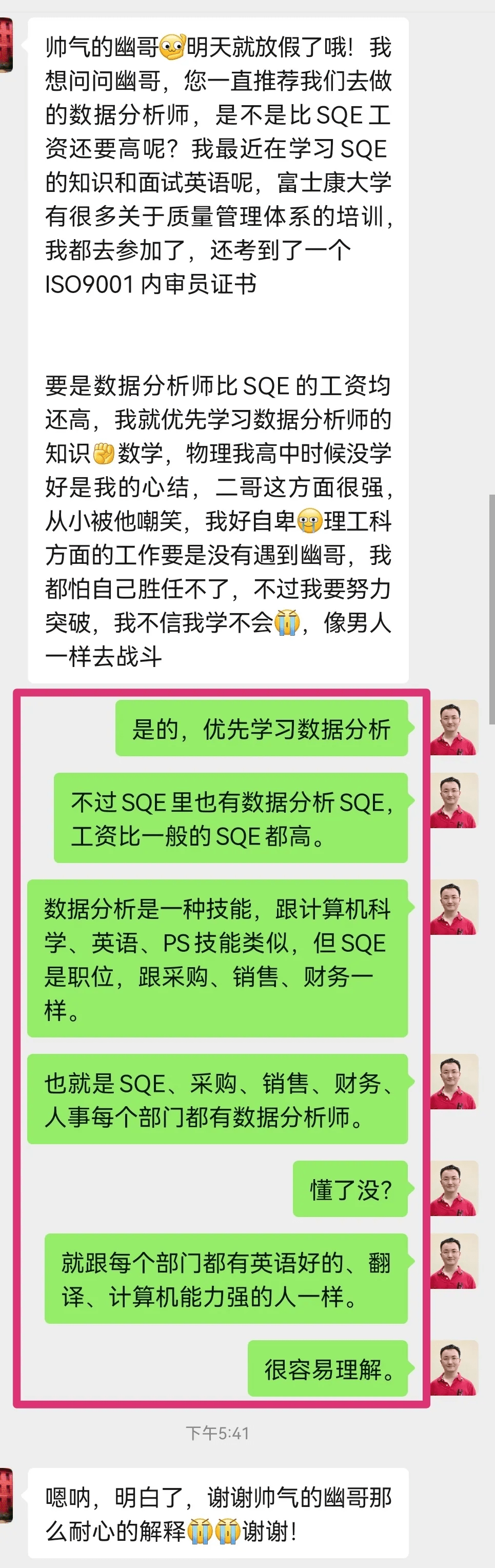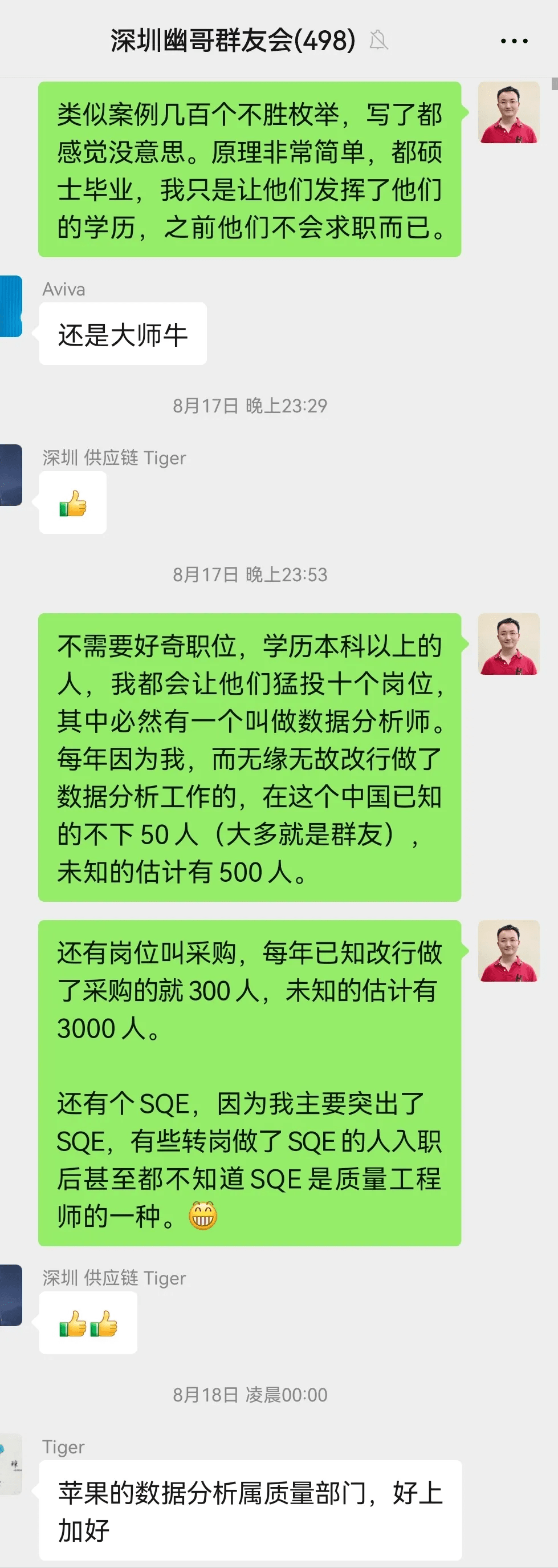 每年因為我的文章或者受我職業思維影響,而跨行、跨崗、改行的人,都很多,包括轉到質量工程師、SQE、數據分析師、人事、項目經理的等等。