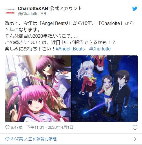 今年動畫《Angel Beats!》迎來播出十周年紀念,《夏洛特》也迎來播出五周年紀念,而一同宣傳兩作的官方推特也在同日發出讓粉絲期待後續作品的推文內容。