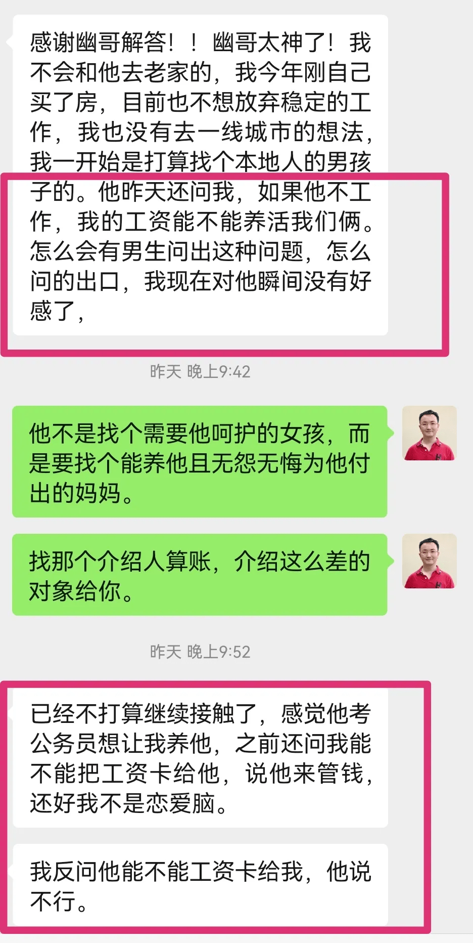 這種,剛開始談戀愛,就各種試探你、倒逼你,讓你上交工資卡、他自己的卡不交給你,還問他不上班的話你的工資能不能養活他。