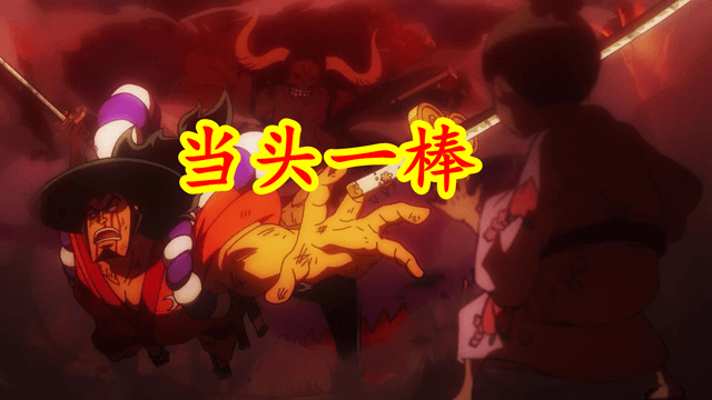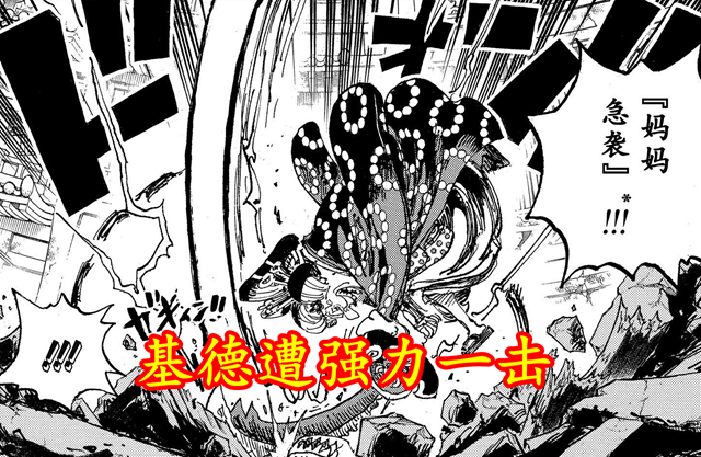 凱多使用狼牙棒,本身也是傷痕累累,匆忙一擊,打中御田頭部,御田昏倒。BIG MOM使用雷電刀,本身沒啥損傷,狀態飽滿,使出蓄力的一擊,正面劈中基德,基德趴了一會兒後,宛如沒事人微笑站起。