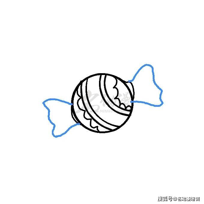 第二步:在上述步驟的基礎上繼續增加細節,曲線兩邊用波浪線畫出小花紋,豐富糖果紙的內容。最後畫出糖果紙的兩個小翅膀,和畫蝴蝶結一樣,不過變成糖果時翅膀變小了。