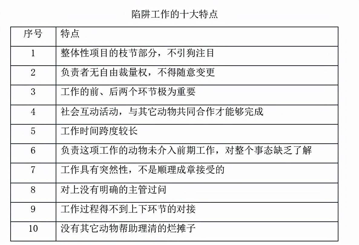 陷阱工作不急,但工作量極大,而且幾乎全部是互動性活動,屬於那種必須與其他人合作才能完成的工作。有人,就免不了有矛盾,在此環節之前的諸多矛盾將會集中在這一層突然爆發,從而導致龐大的項目整體性失敗。