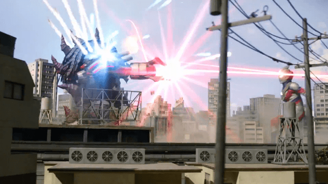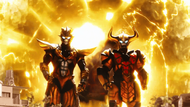 小金人塔爾塔洛斯打開了傳送門,將戴亞博里古送到城市之中。戴亞博里古是歐布劇場版中初登場的機械怪獸,全身都是武器,是一座活著的軍火庫。雖然沒有了棘手的晶化光線,但無數的武器,堅硬的裝甲,依然很難纏。