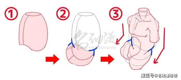 第一步:繪制人體時,將體塊分成肋骨與盆骨兩部來思考畫畫的話,復雜的人體結構就會變得容易理解起來。首先將肋骨和骨盆兩個體塊放在一起,隨後畫上肌肉,畫出腰線,這樣就畫出人的身體啦。不管畫什麼動作都可以使用這個方法,如果是比較復雜的動作可以參考真實的照片進行刻畫,第一步就是找出人體最重要的兩大體塊,第二步注意體塊之間的透視關系,這樣畫起來很容易得到事倍功半的效果哦。