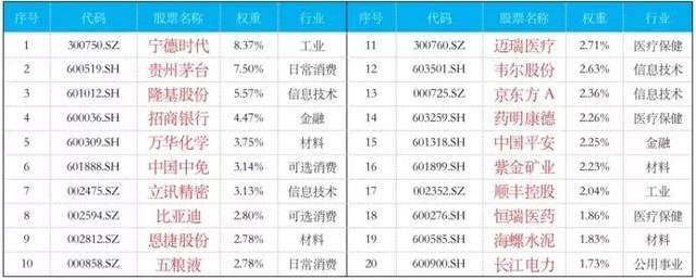 這個指數橫跨滬深兩市,選取各行各業龍頭股,其中最大的兩個權重股,就是寧德時代和貴州茅台,可以說把「茅指數」和「寧組合」一網打盡!
