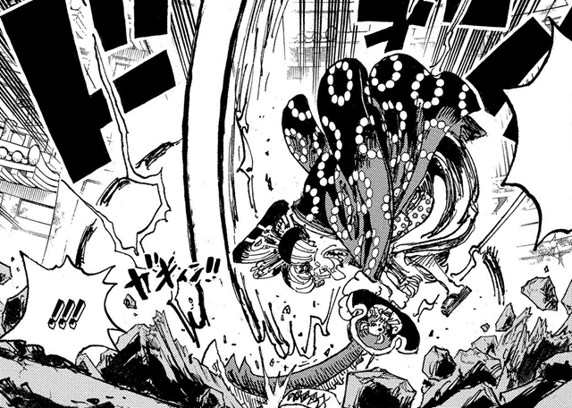 四皇BIG MOM太過強大,基德和羅覺醒使用覺醒能力。羅釋放「KRoom」,用刀刺向BIG MOM,從內部產生破壞,BIG MOM內傷吐血。基德將BIG MOM變成了磁鐵,被吸引來的許多武器打中。