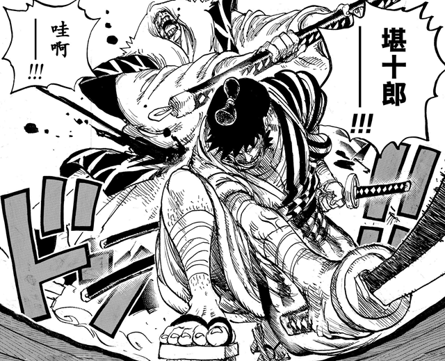 被凱多打敗的錦衛門,身體一分為二,下半身跑到了一、二層的樓梯處。這個離譜操作的原因,是錦衛門之前被羅的能力切割,恢復時沒粘好。看來,凱多一刀沒捅死錦衛門,而是捅到了粘貼處,導致錦衛門上下分開,錦衛門也因此得救了。