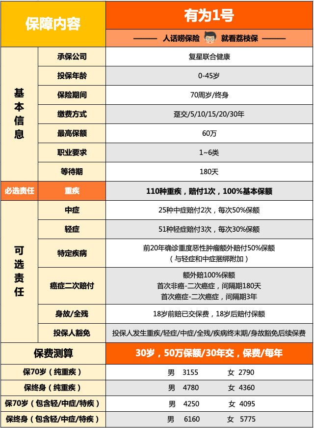 有為1號作為一個重疾險,必選項目自然是重大疾病保障。