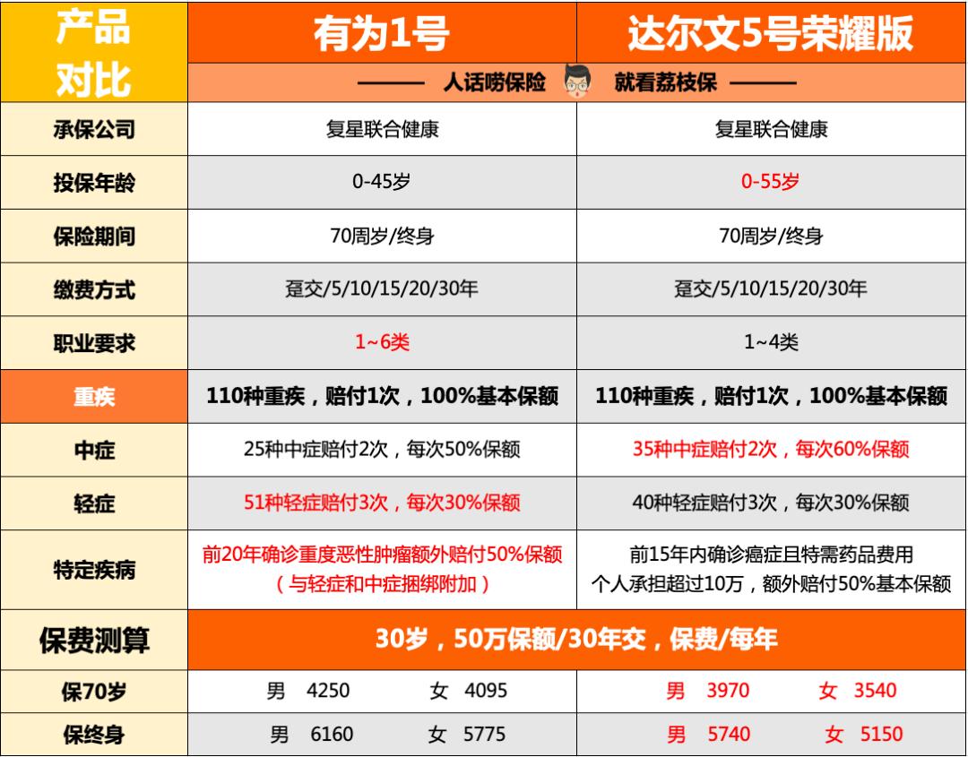 對比看看,加了輕症和中症後兩款產品誰更劃算——