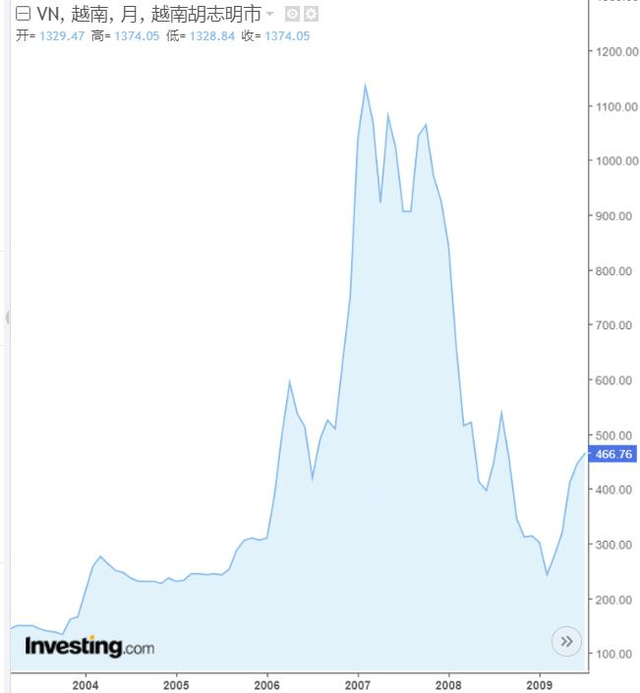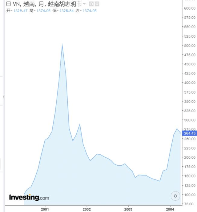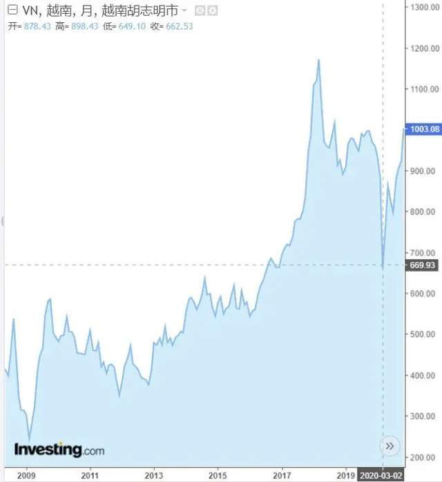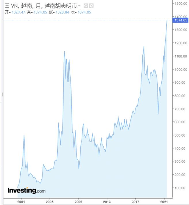 越南股市是2000年成立的,下面是胡志明指數這20年的走勢: