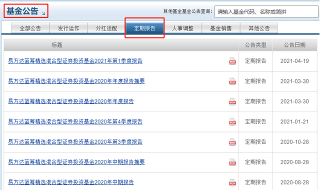 一般在基金銷售平台的「基金公告」中,可以查閱定期報告。
