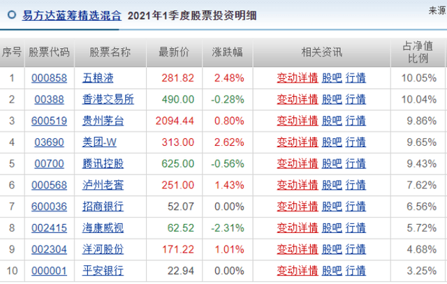 張坤還有一隻基金,易方達優質企業。根據一季報,該基金只有105億規模,是易方達藍籌精選八分之一的規模,但它仍然大量持有白酒股。
