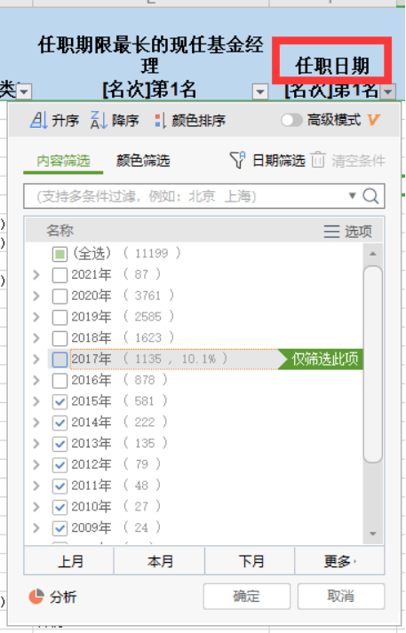 第二步,排除現任基金經理任職時間晚於2014年12月31日的基金,如有多位經理共同管理,以任職最久的一位為准。