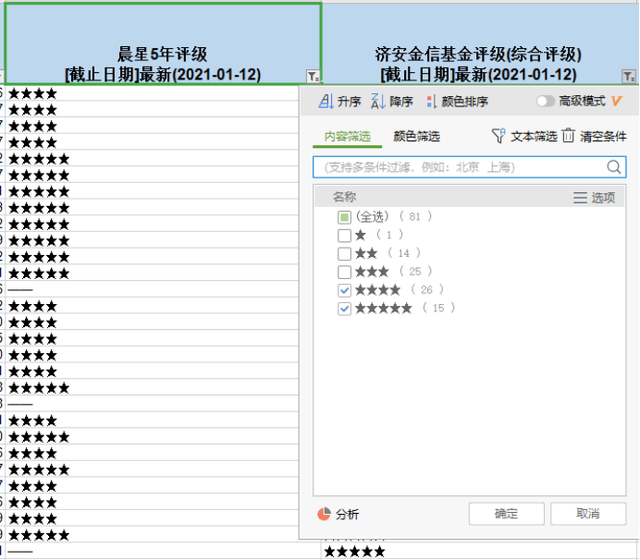 第四步,選出晨星五年評級與濟安金信綜合評級都在四星及以上的基金。