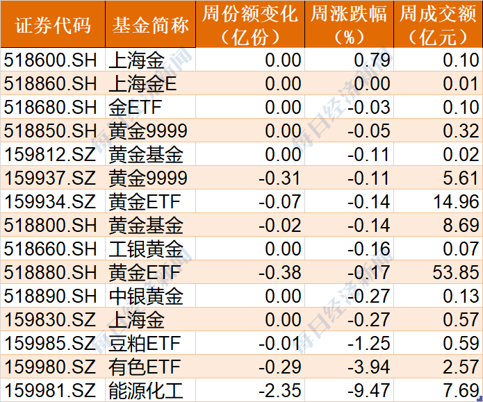 商品ETF本周大部分下跌,能源化工、有色ETF和豆粕ETF分別下跌了9.47%、3.94%和1.25%,此外黃金相關ETF平均下跌約0.15%;此外份額上,能源化工減少了2.35億份。