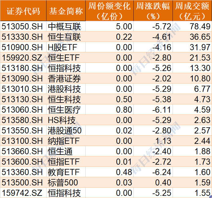 跨境ETF本周成交額超過1億元的有17隻,除納指ETF和標普500小幅上漲外,其餘均出現下跌,其中教育ETF、恆生醫療跌幅超6%;份額上,中概互聯增加了5億份。