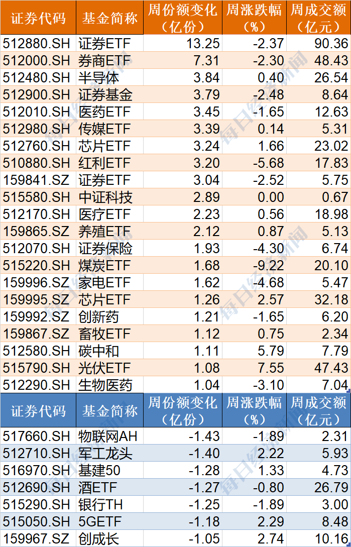 在行業主題ETF方面,本周份額增長超過1億份的有21隻基金,證券ETF、券商ETF和半導體份額分別增加了13.25億份、7.31億份和3.84億份。
