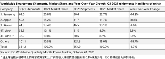 在2021年Q3季度的全球市場中,市場迎來了新一輪的「洗牌」,蘋果依靠著iPhone13開始發起反擊,全球第二的小米自然也被蘋果反超,成為了第三,第一名依舊是三星,這一點意料之中。由此可以看出,小米在高端市場的影響力上,依舊還是有待優化和發展,至少與華為、蘋果這種品牌相比還有很大的差距。