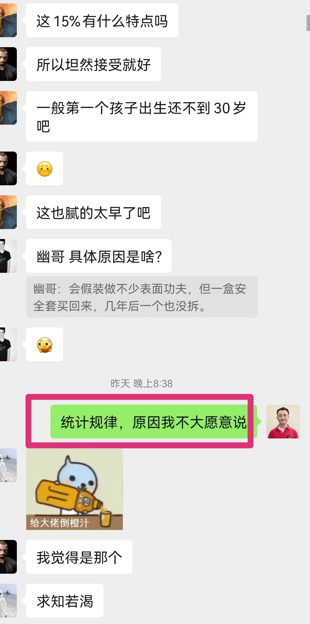 最近不少群友和讀者、星友問過類似的問題。我此刻告訴大家,我說的這15%是我統計的數字。我有過2萬個咨詢案例,都真實的人,基數已經不小了,根據過往的規律,可以說,群友和讀者的規律,就是當下國內大多數人的規律。這就有了向大家介紹這種特殊婚姻統計結果的機會,沒有調查沒有發言權。