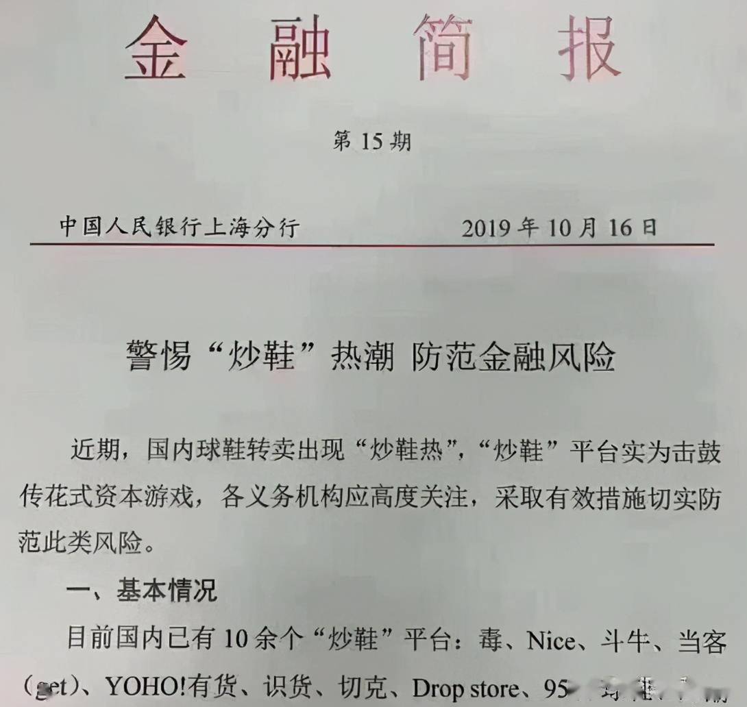 央行上海分行早在2019年10月,就曾發文《警惕「炒鞋」熱潮防範金融風險》指出炒鞋平台實為擊鼓傳花式資本游戲。另外值得注意的是,炒鞋的背後可能涉嫌非法集資、金融詐騙、非法傳銷等涉眾型經濟金融違法行為。