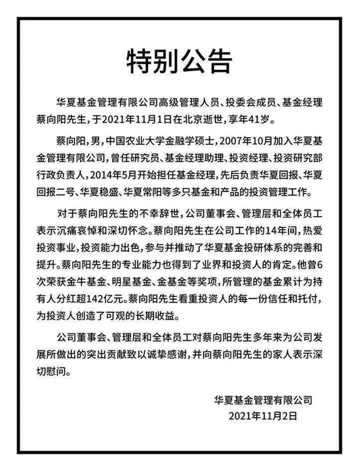 今天,基金圈最讓人震驚的消息,無疑就是華夏基金公司基金經理蔡向陽不幸逝世的消息了。