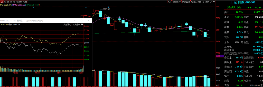 今天三大指數小幅下跌,滬指失守3500點整數關口,創業板高開低走一度跌超1%,盤面上大小股表現各異,但兩市上漲家數為3100多家,主要權重股下跌較多。