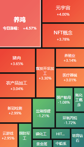 今天領漲的主要是養豬養雞、元宇宙、新冠概念和煤炭板塊;領跌的則是軍工、光伏、鋰電、氟化工等板塊。