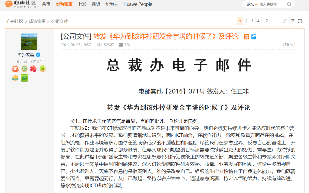 今年8月份,華為心聲社區轉發了一篇名為《華為到該炸掉研發金字塔的時候了》的文章,這篇文章由華為創始人任正非親自簽發。值得一提的是,這篇文章最早發布於2016年,華為時隔五年再次轉發這篇文章肯定是有深意的。