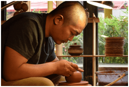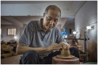 2010年,因喝茶喜愛上茶壺,就遠赴千里之外的潮洲,想跟制壺人「俊合號」手拉壺傳承人謝華拜師學藝,沒想到這一拜就是3年。