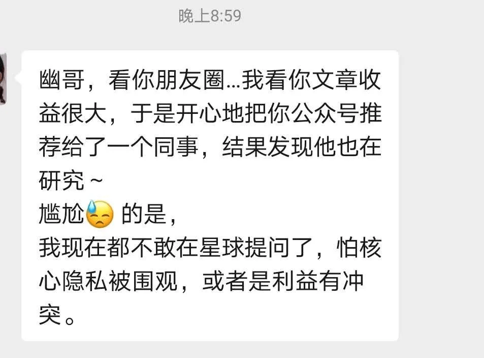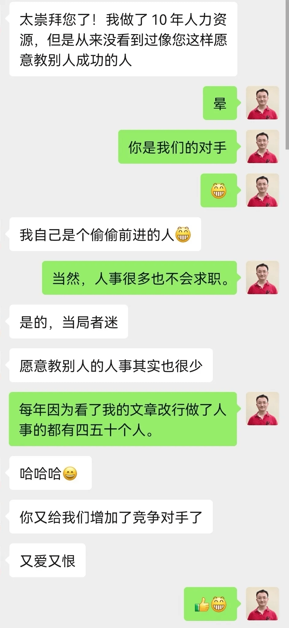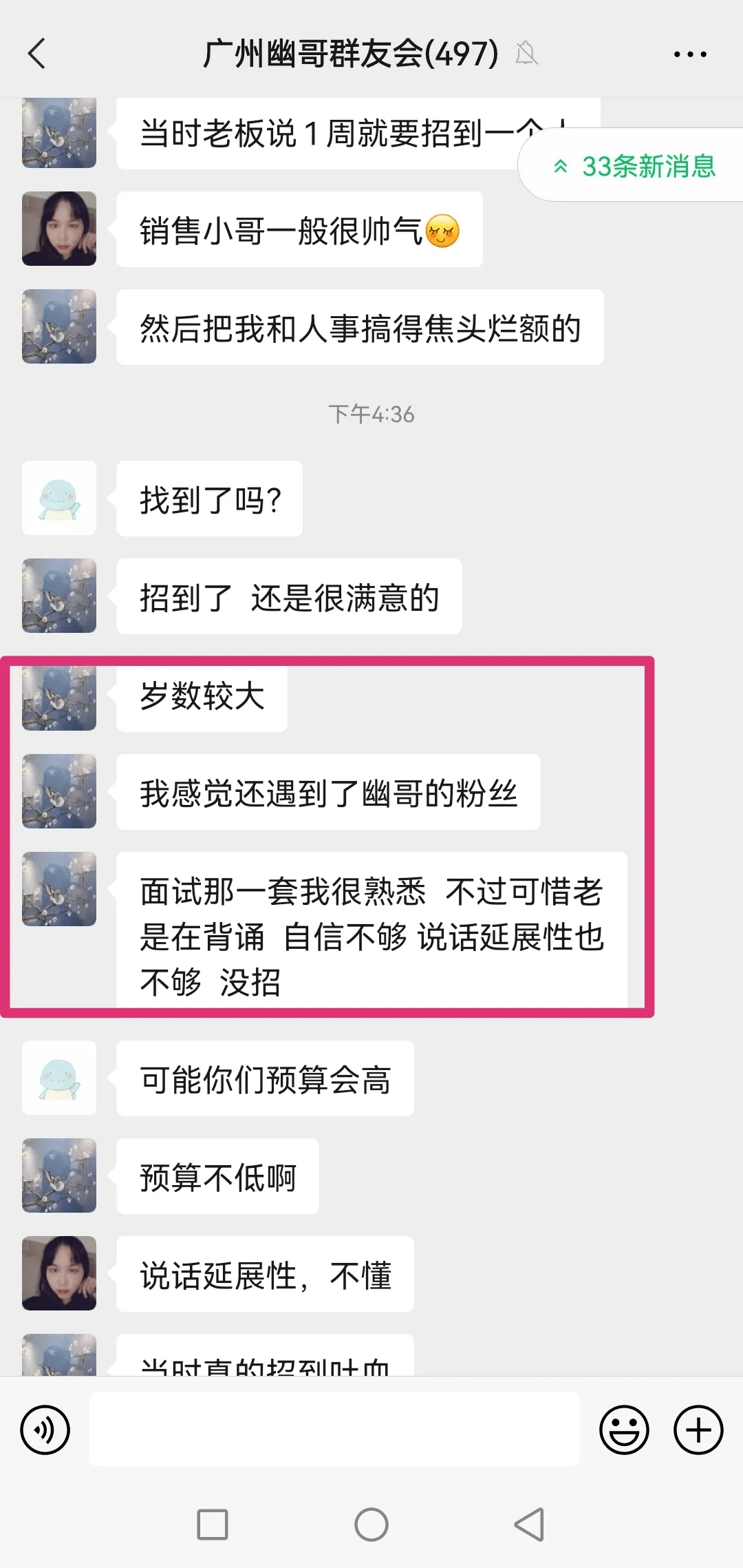 一開始面試,師兄聽她的離職原因,明顯感覺出來了,就問她:「你是不是幽哥的粉絲?我也在群里。」實際上,這位師兄人事經理目前還在我的倆群里。