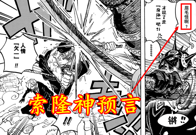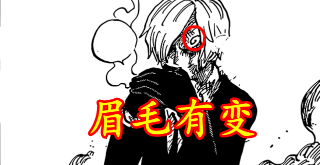 有關山治眉毛的變化,其實早幾話前,就已經有人預言中了。在漫畫1023話,索隆和山治聯手激戰燼和奎因,當時山治說剛剛第二次穿了戰斗服後,身體就有點古怪,索隆聽完立馬回答,是「眉毛怪嗎」。