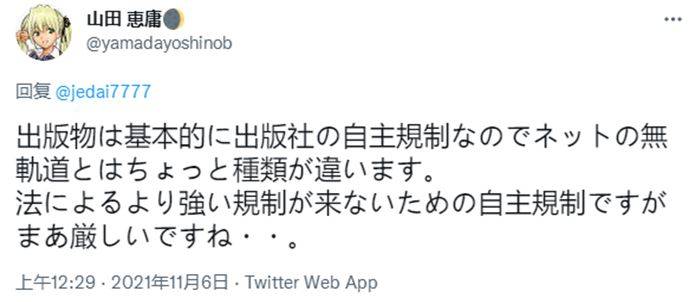 不過在評論區討論的過程中,他也提到了不得不採取這種限制的理由:「和放縱的網絡不太一樣,出版物基本是受到出版社的自主規制。為了不被法律強行限制,就需要嚴格的自主規制了……」