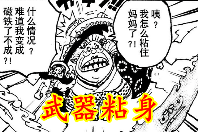 BIG MOM被基德變成磁鐵,手中的武器拿破侖被緊緊吸在身上,無法使用。基德的這個能力,對武器使太不友好,一旦武器使本身被賦予磁力,手中的武器將被緊緊吸在身上,這還怎麼使用武器戰斗。