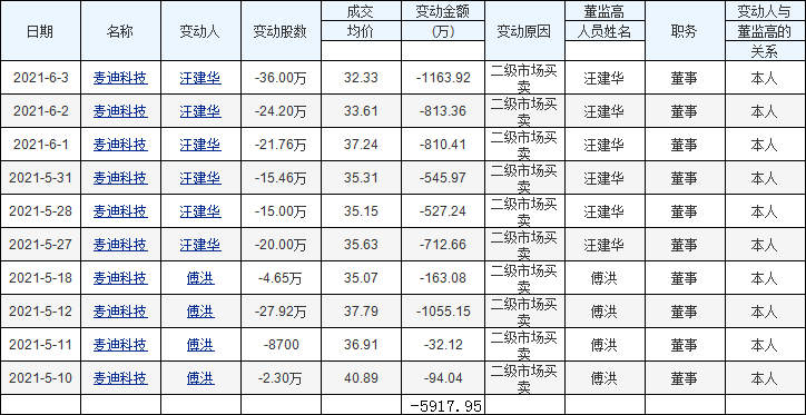 不僅如此,伴隨著股價不斷下跌,麥迪科技董事汪建華、傅洪紛紛拋出了減持計劃,其中在5月10日至6月3日期間,二人合計減持套現近6000萬元;以及股東陸平在8月3日至10月31日期間,累計減持70.35萬股,減持均價23.677- 25.67元/股,套現金額近1800萬元!