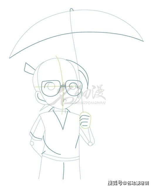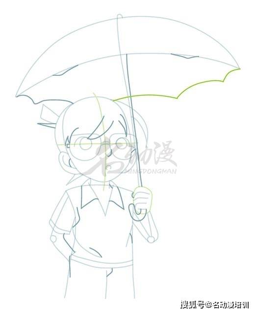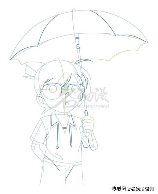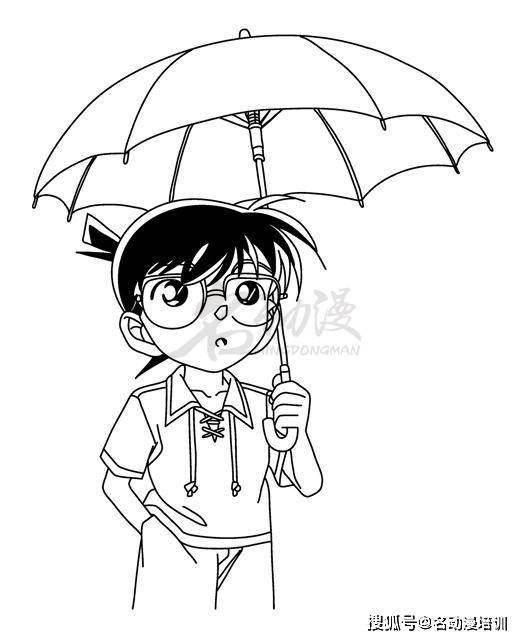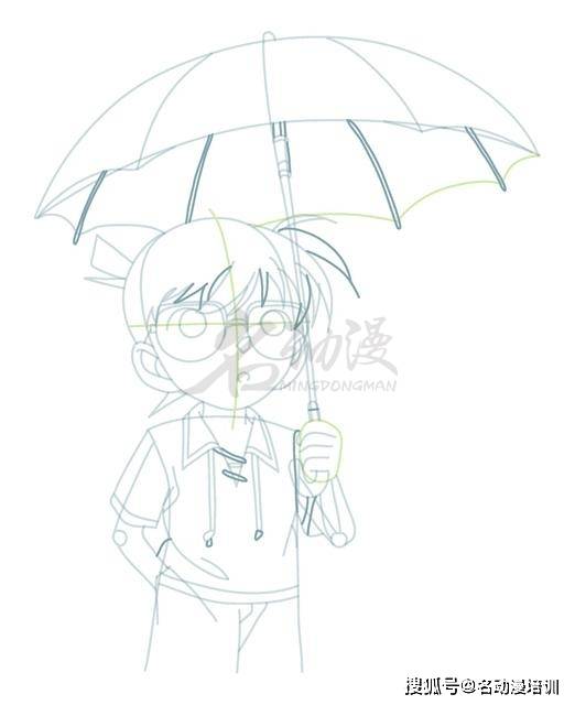 第三步:深入刻畫細節。還是新建一個圖層,在新圖層上面繼續深入刻畫,如下圖所示的深色線條,我們逐一將雨傘的傘骨、柯南的劉海、眼鏡、衣領、褲子等地方畫出來。到這里,柯南的整體雛形就畫出來了。