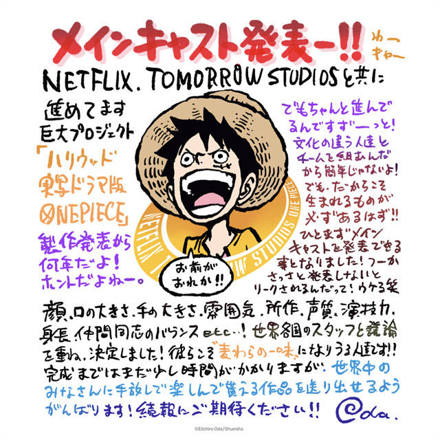 近日,好萊塢真人版《海賊王》公開五位主演以及演員定妝照,並且宣布該作品第一季暫定10集,播出時間未公開。主角路飛由18歲的墨西哥演員伊納基·戈多伊飾演,刀客索隆由日籍演員新田真劍佑飾演,娜美則由美國演員艾米莉·拉德飾演,烏索普的扮演者是雅各布·吉布森,塔茲·斯凱拉則會飾演山治。