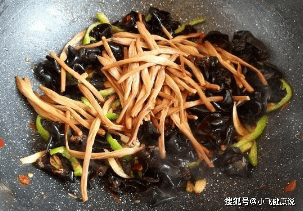 烹飪第六步:鍋底不用清洗,鍋中加上油若干,加上干木耳和黃花菜變成,用鍋鏟炒均勻,加上一些青椒絲和紅椒絲,煸炒均勻即可。