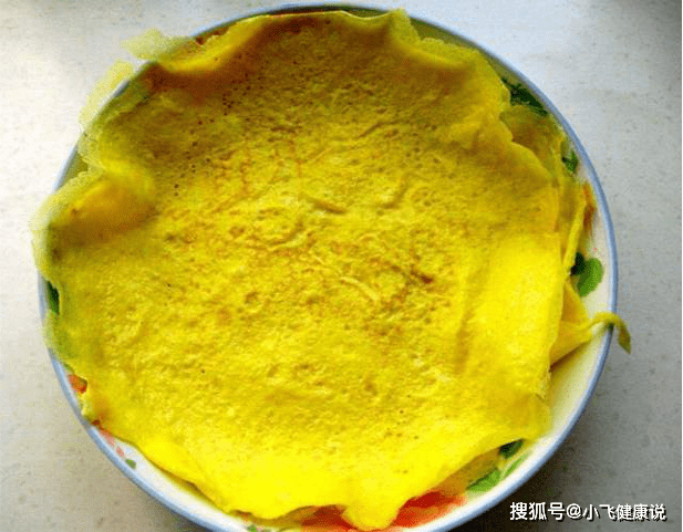 第四步:准備一個平底鍋,然後刷上一些食用油,油溫至溫熱,將調好的雞蛋液下鍋,將雞蛋煎成麵皮,然後將雞蛋皮切成細絲。