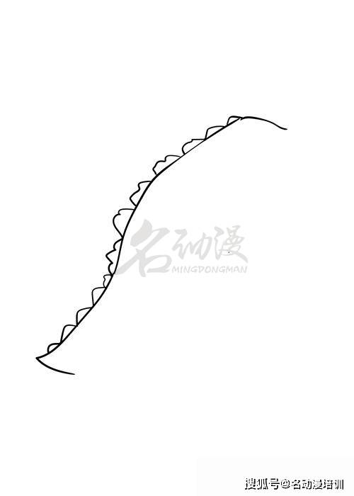 第一步:首先,我們從哥斯拉的背部開始畫,由頭部到尾巴一筆將它的背部畫出來,注意筆畫的起伏,然後在背部畫上大大小小的三角形尖刺。這樣哥斯拉的雛形就畫出來了。