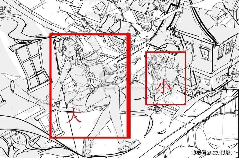 如畫面就運用到了對比構圖,以小襯大,大的人物要比小的人物在畫面中更加突出,使得內容更加的有趣。