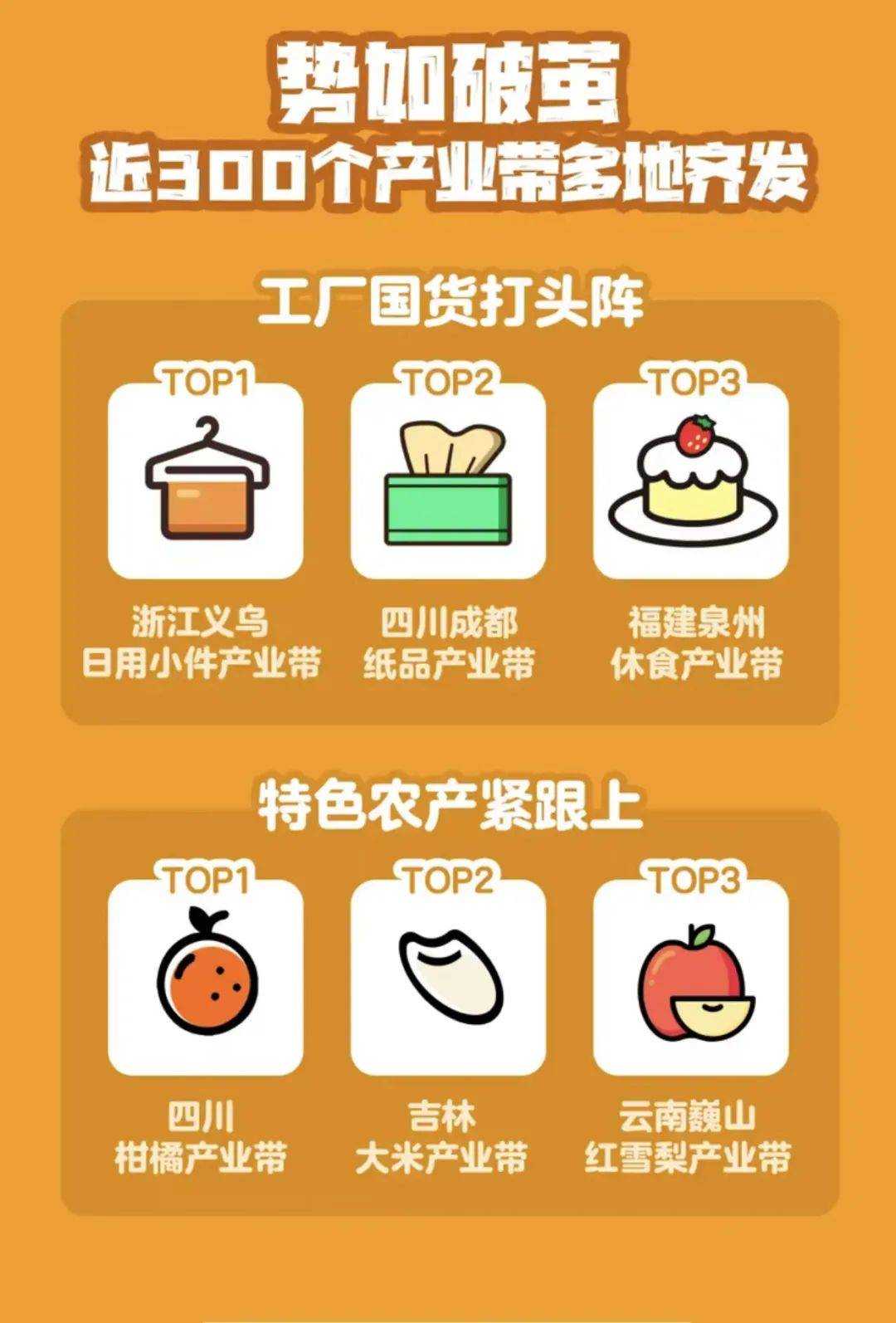 11.11期間,浙江義烏日用小件產業帶、四川成都紙品產業帶、福建泉州休食產業帶,一舉沖進最受歡迎的中國造產業帶TOP3 ,而四川柑橘產業帶、吉林大米產業帶及雲南巍山紅雪梨產業帶,更霸榜了最受歡迎的中國產農產地TOP3。