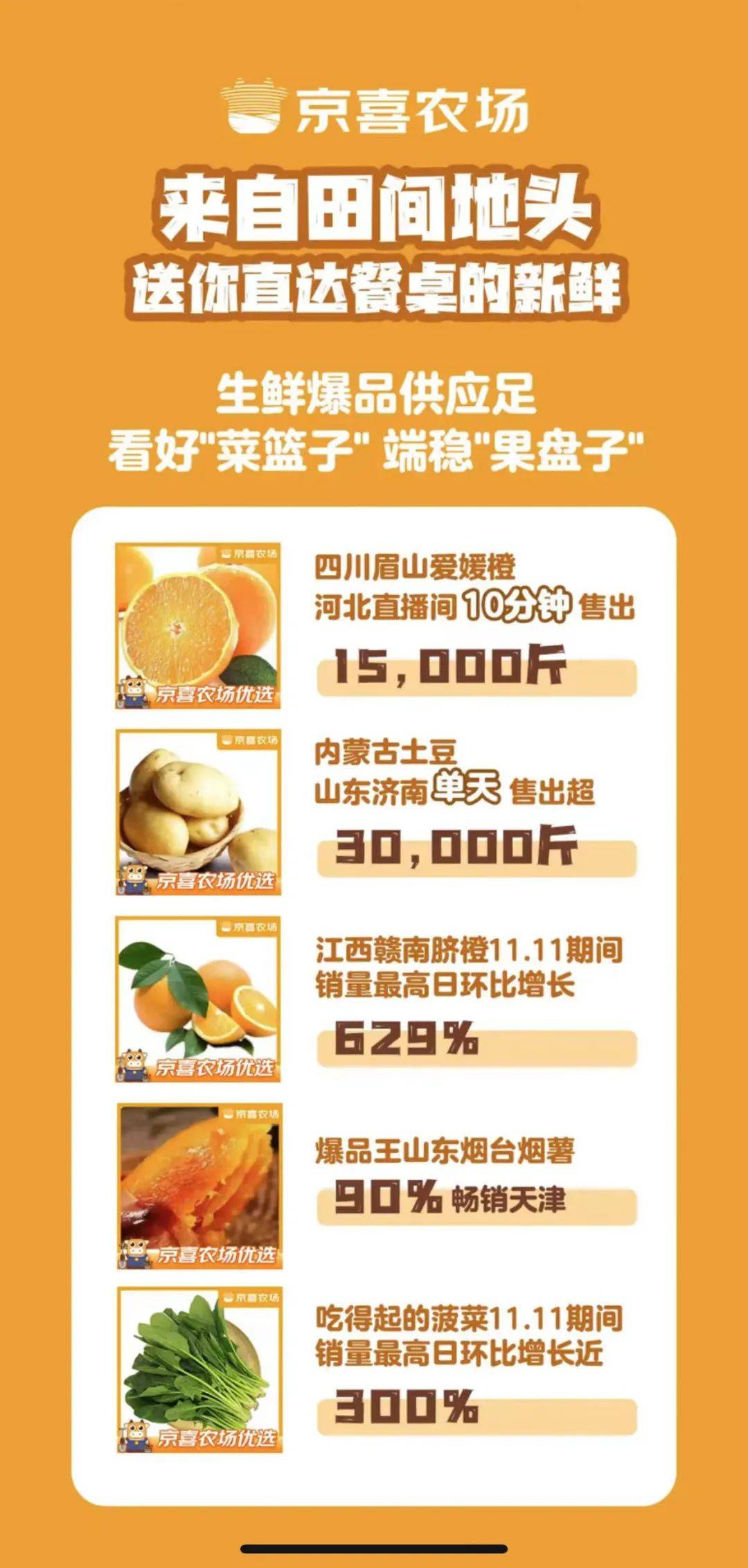 據悉,京喜11.11期間有近300個省級爆品突破萬單,其中四川眉山愛媛橙河北直播間10分鍾售出15000斤,內蒙古土豆山東濟南單天售出超30000斤,江西贛南臍橙11.11期間銷量最高日環比增長629%……