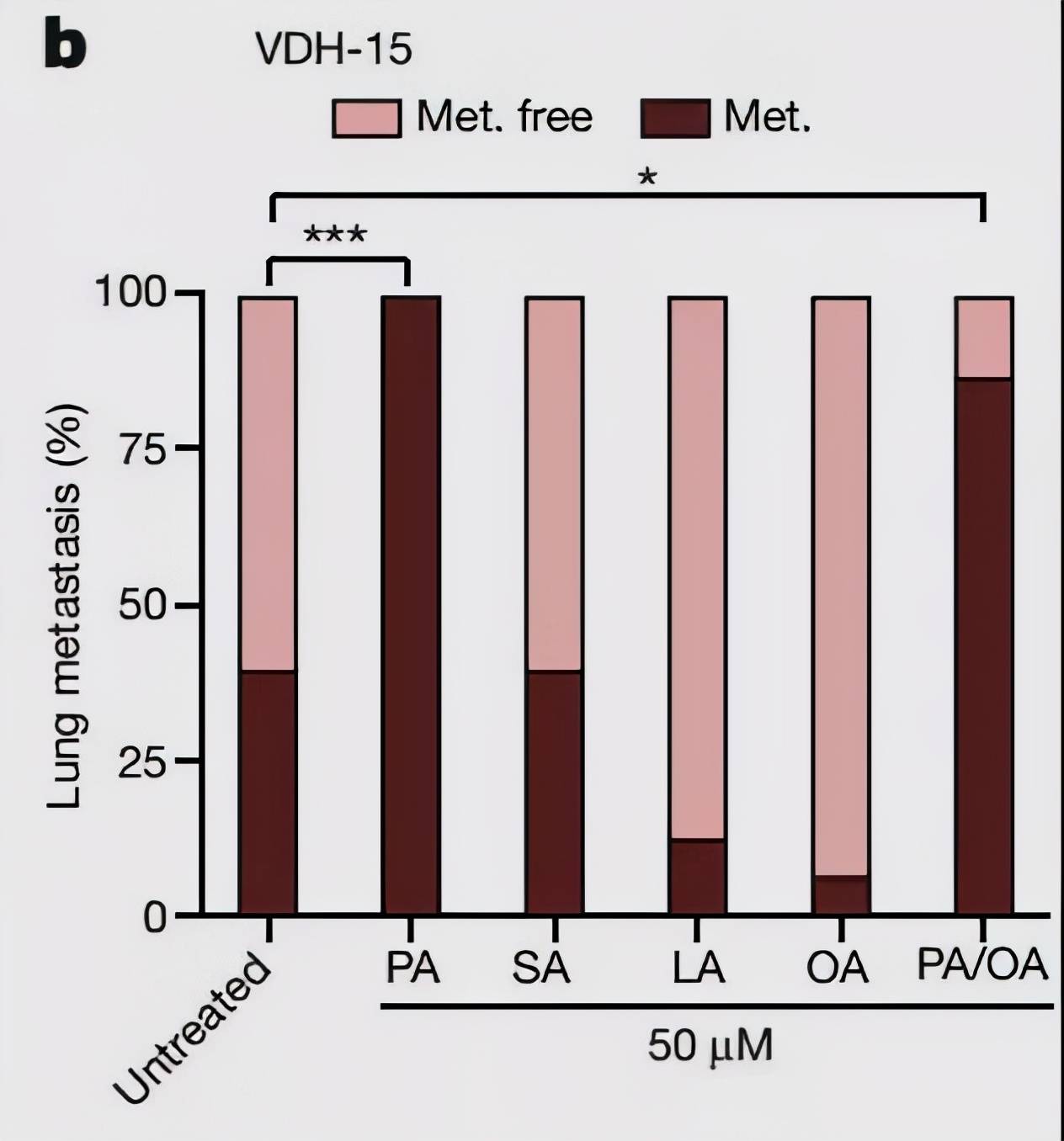 而通過試驗分析,這3種脂肪酸都不會影響原發癌的生長,但棕櫚酸顯著卻能增加了轉移灶的數量和大小,同時還會誘導細胞表面CD36的表達。