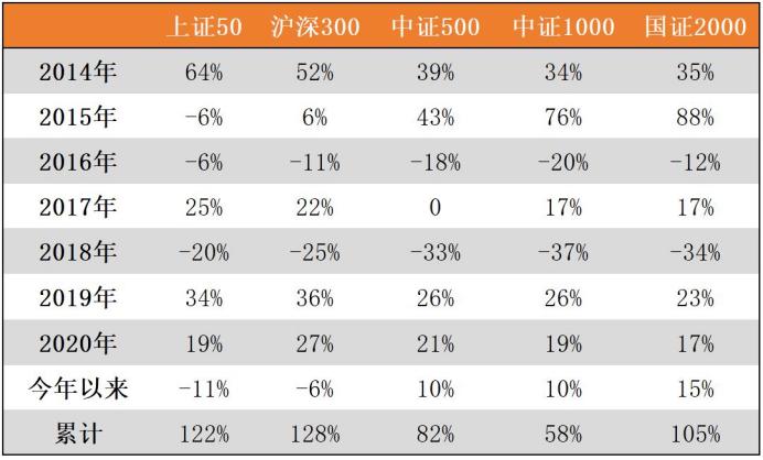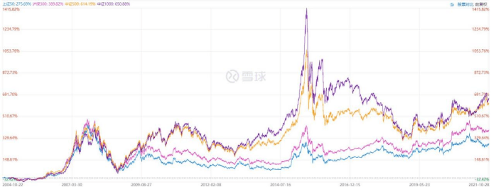 上證50至今收益率為276%,滬深300為390%,中證500為614%,中證1000為651%。